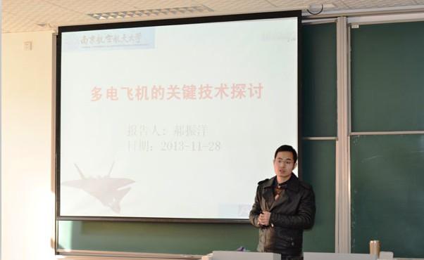 2013年11月28日上午10时,网上购买双色球 “紫冬话坊”系列讲座活动之“术响南航”青年教授论坛第一场学术讲座在A18号楼231教室顺利进行。本次活动很荣幸邀请到了电气系青年教师郝振洋副教授为网上购买双色球 研究生作题为“多电飞机的关键技术探讨”的学术讲座。