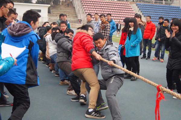 拔河比赛的开始掀起了运动会的高潮。各队选手紧拽赛绳、含胸扎马、牙关紧咬、双目圆睁,可谓是锱铢必较、寸土必争。即使有的选手摔倒在地,不闻裁判哨响也坚决不放手中赛绳,将团队合作精神与个人的坚韧顽强表现得淋漓尽致。