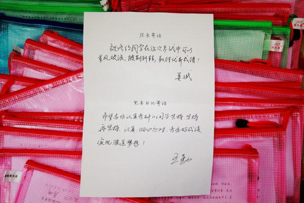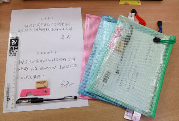 200多份爱心文具袋,包含一支黑色签字笔、一把小刀、一块橡皮、一把直尺、一封《致10级考生的信》及网上购买双色球 院长姜斌教授和党委书记王勤教授亲笔撰写的深情寄语,内容不多但心意满满。