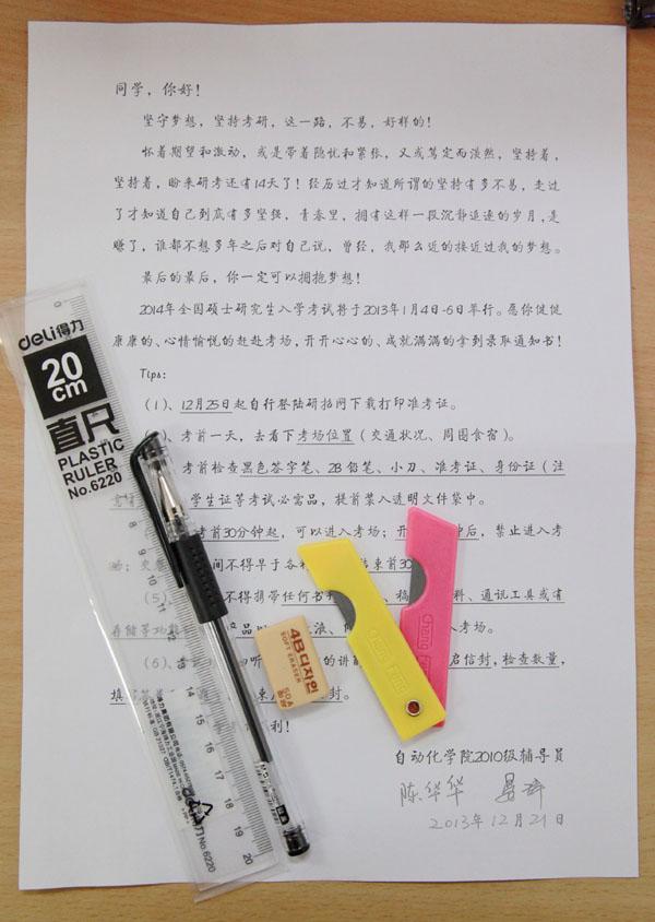 2014年全国硕士研究生入学考试将于2013年1月4日-6日举行。最后的备考正在如火如荼地进行,准备时间已不足半个月。网上购买双色球 领导、老师和辅导员为帮助2010级200多名备考学生调整身心状态、做好冲刺阶段的各项工作,精心准备了一份礼物为考研学子保驾护航。