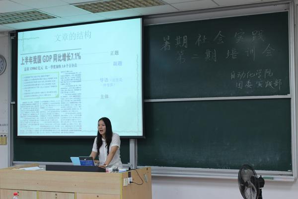 第一期培训涉及暑期社会实践总体介绍、队长的职责和宣传员的职责。实践部干事对今年社会实践的主题和申报材料注意事项进行了介绍,校级长期立项项目“支点人生”团队和“格桑呵护”团队的代表与大家交流分享了去年的实践经历与感悟。