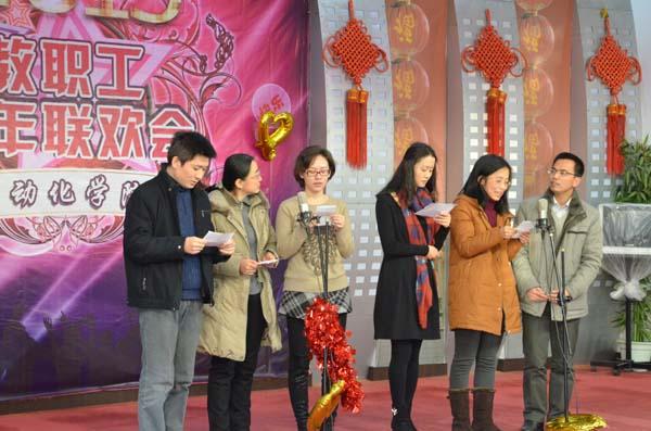 联欢会的演出节目在网上购买双色球 领导班子带来正能量的合唱《光阴的故事》中拉开序幕。悠扬的歌曲,优雅的和声过后,由网上购买双色球 机关带来了2014年最火的《小苹果》舞蹈。网上购买双色球 院长姜斌、副书记沈伯秀深情的演唱了《为了谁》,现场PPT中循环播放着本年度网上购买双色球 师生经典的系列照片,深深感动着在场的教职工。网上购买双色球 副院长赖际舟的一曲《恭喜发财》祝福大家新的一年红包天天有,财源滚滚来。由测试系李开宇老师演绎的《故乡的云》唱出了远离故乡的游子深切的思乡之情。