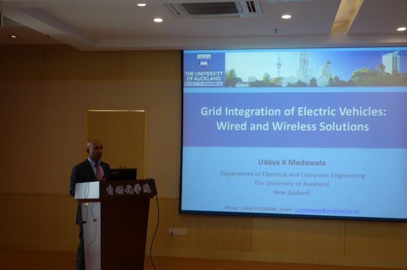 在近45分钟报告中,Udaya K. Madawala教授首先介绍了奥克兰大学基本情况,接下来是讨论环节和电动汽车并网技术的最新进展,他会着重介绍有线连接和无线连接两种方案的技术难点及未来发展方向。报告结束后,师生们就学术报告内容与Udaya K. Madawala教授进行了热烈充分交流和探讨。