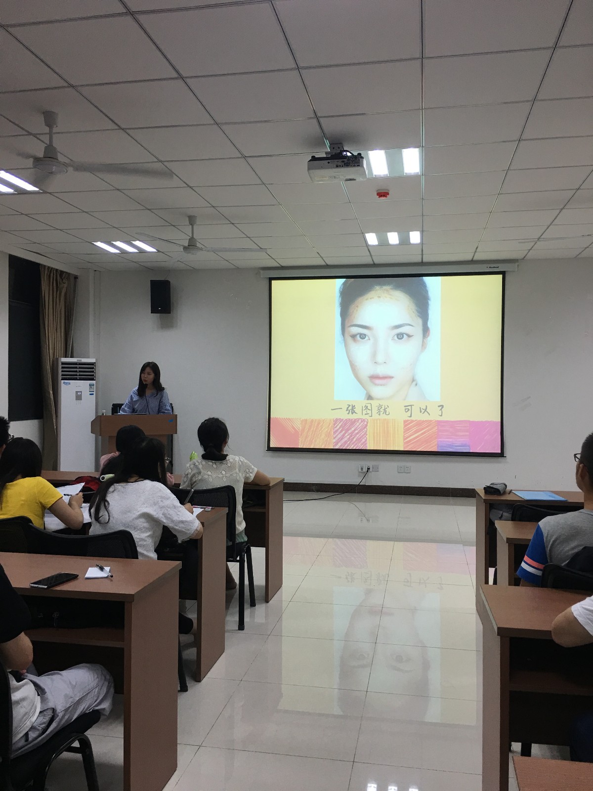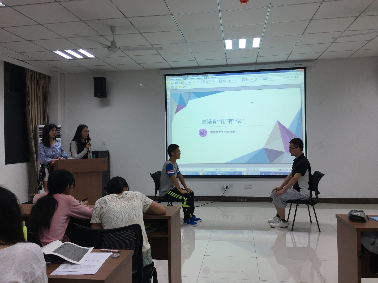 为了让同学们更好地掌握面试礼仪知识,讲座现场模拟了面试的过程,邀请同学分别扮演面试官和应聘者。徐琳详细点评了模拟过程中同学们表现的优秀和不足之处,同学们都受益匪浅。随后礼仪队的另一位同学简单介绍了面试化妆的技巧,让同学们对化妆知识有所了解。