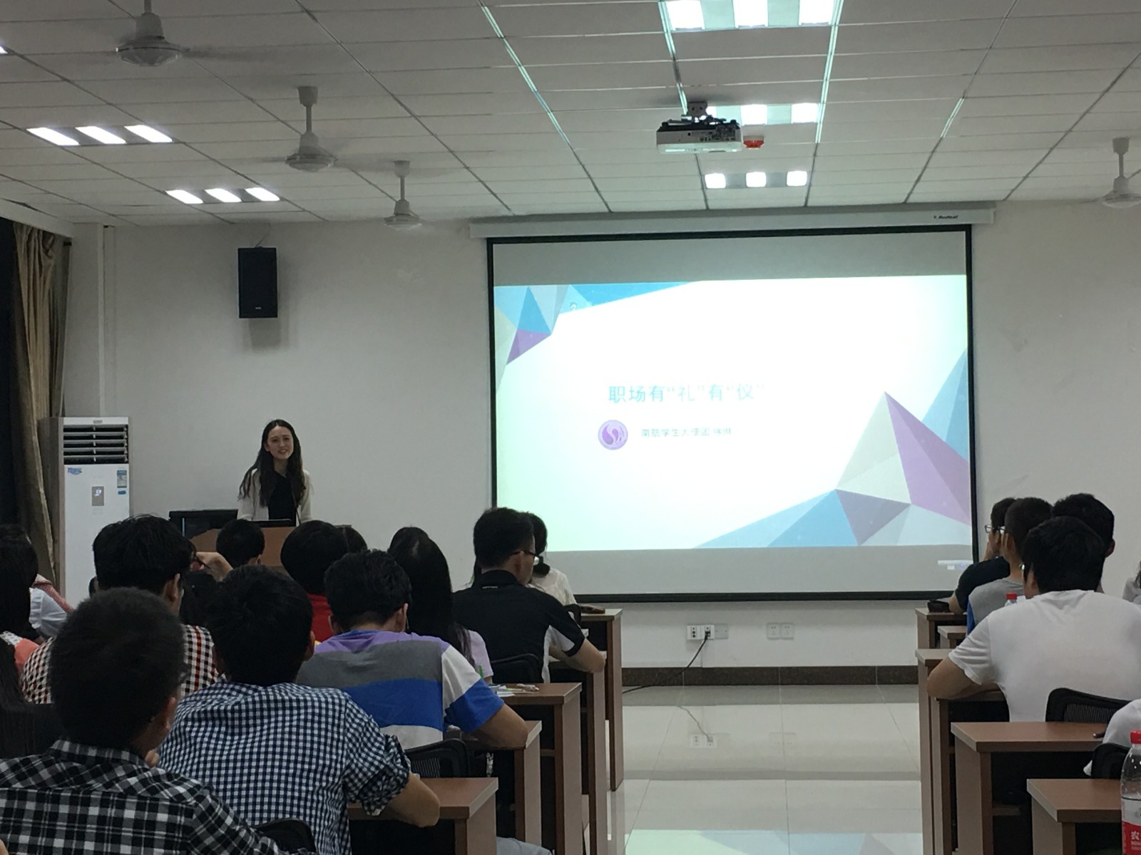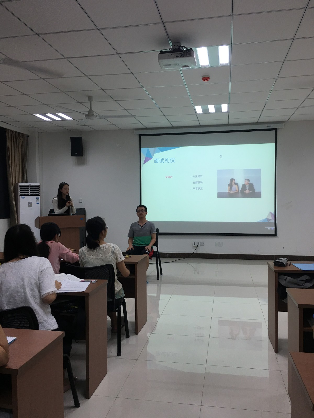 礼仪队的徐琳同学首先以她自身的面试经历引出面试礼仪的重要性,接着根据面试的流程从面试到达的时间、问候方式、入座仪态、交谈技巧四个方面详细讲解了面试时候的注意事项,并且亲身示范,令同学们有了深刻的印象。她不仅从男生、女生两个不同的性别角度深入讲解入座仪态、着装规范,还邀请同学们上台演示,现场指导同学们的面试坐姿、面试着装和日常发型衣着。