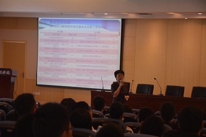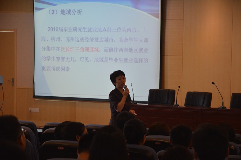 大会于十点准时开始,沈伯秀副书记首先从网上购买双色球 往年研究生的就业情况入手,一方面从纵向角度介绍了不同毕业时间硕士生的就业情况,另一方面从横向角度介绍了网上购买双色球 不同专业硕士生的就业情况,为在座学生大致勾勒出一幅网上购买双色球 就业印象图。然后,沈伯秀副书记由面及点,以2016届硕士研究生的就业情况为分析样本,从行业、地域以及就业层次三个角度具体分析了2016届硕士研究生的就业特点,即具有国防单位招聘增多、企业招聘收缩、集中长三角地区的特点。
