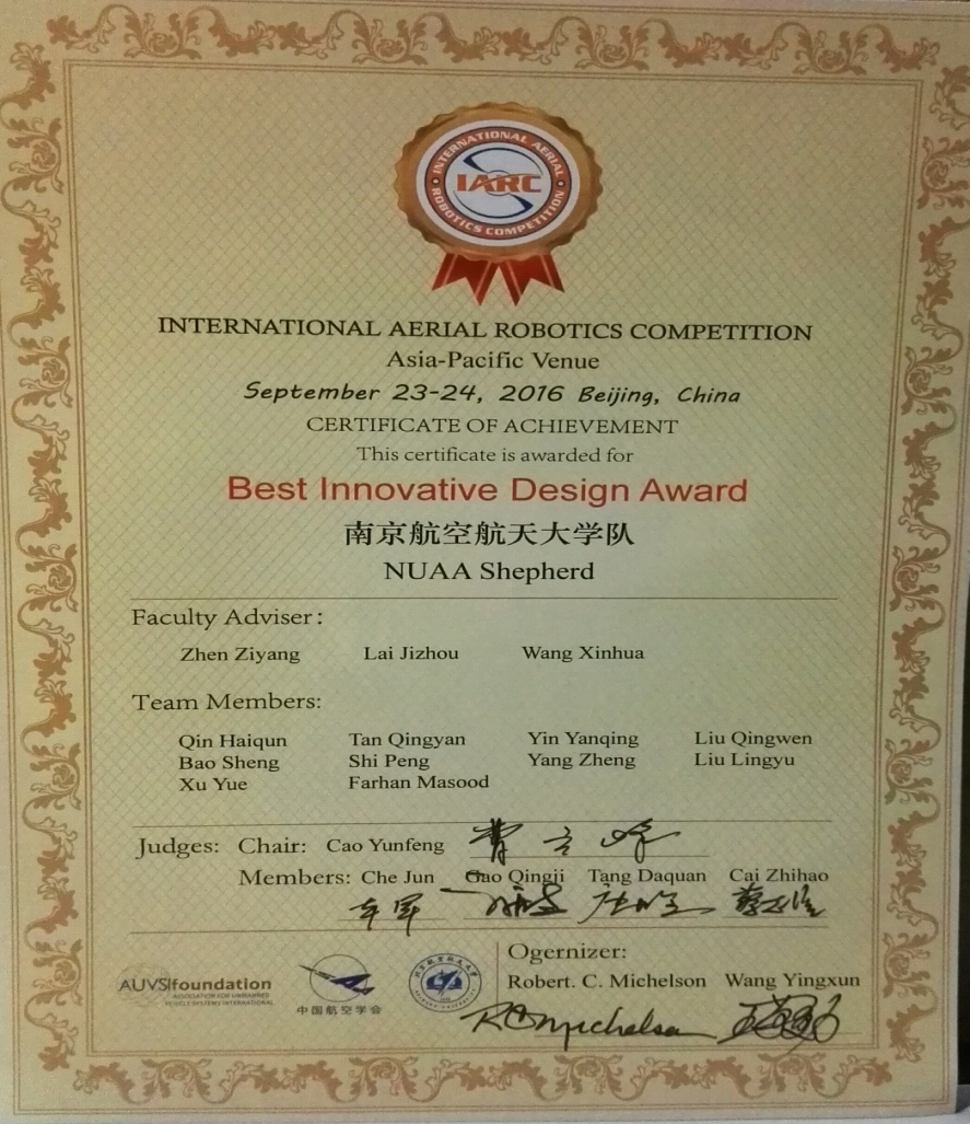 大赛包括技术答辩、静态评判、现场比赛等环节,进行飞行器设计、精确导航、自主控制等方面的创新技术展示。由网上购买双色球 甄子洋副教授、赖际舟教授和王新华副教授等指导的研究生团队(覃海群、谈青艳、尹彦卿、刘青文、包胜、石鹏等)自主研制的六旋翼无人飞行器完成了自主起飞着陆、目标机器人跟踪、室内避障等一系列规定动作,以优异的表现荣获该项赛事的Best Innovative Design Award(最佳创新设计奖)。网上购买双色球 已是连续第三年代表网上购买双色球 参加此项赛事,每年都取得了优异成绩。
