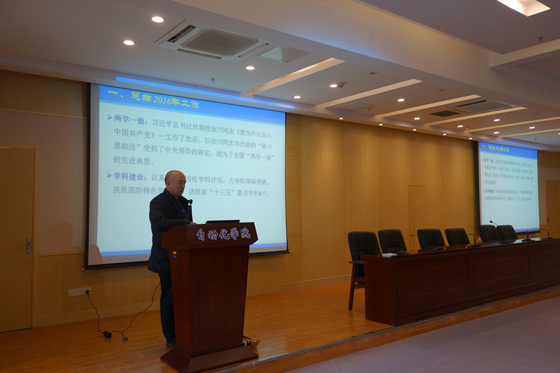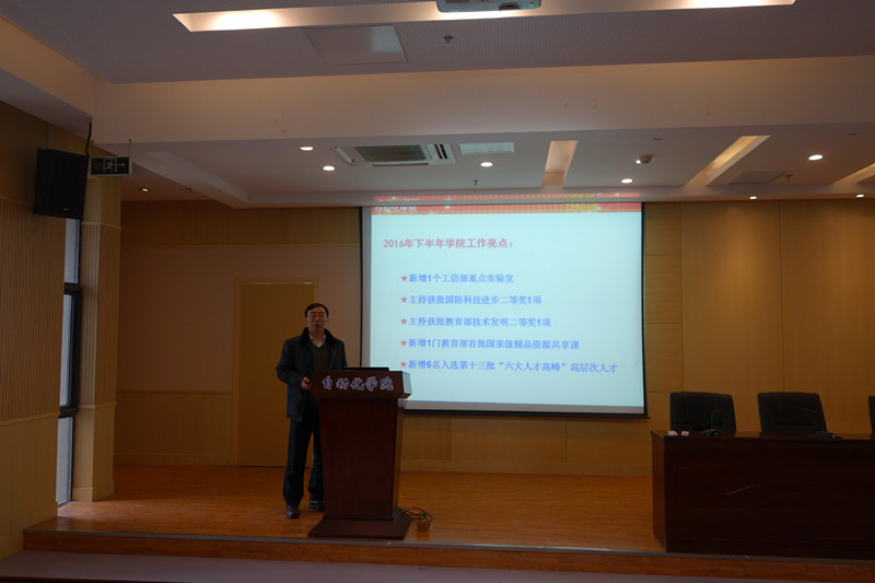 接着,院长姜斌同志代表网上购买双色球 做工作报告,报告从党建、教学、科研、师资、学科建设、人才培养、学生工作和工会工作等八个方面全面对网上购买双色球 2016年下半年的进行全面总结,对2017年的工作进行全面部署。2016年下半年,网上购买双色球 多方面取得了新的突破和发展,突出亮点有新增1个工信部重点实验室,主持获批国防科技进步二等奖1项、教育部技术发明二等奖1项,新增1门教育部首批国家级精品资源共享课,新增6名入选第十三批“六大人才高峰”高层次人才等。姜院长要求全体教师在2017年要以“十三五”规划和“双一流”建设为契机,乘势而上,科学发展,全面推进网上购买双色球 各项工作再上新台阶,为创建研究型网上购买双色球 而努力!