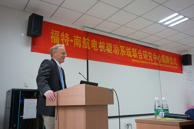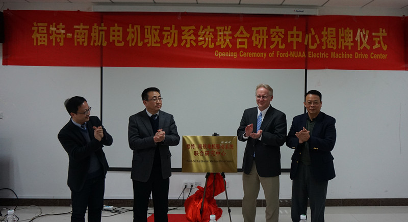 揭牌仪式由国际交流合作处副处长(主持工作)赖际舟教授主持并致辞,感谢福特公司与南航长期以来紧密合作,以及对于建立福特-南航电机驱动系统联合研发中心的大力支持。网上购买双色球 院长姜斌教授致辞,祝贺电机驱动系统联合研究中心成立,并全面介绍了网上购买双色球 情况,表示将尽力支持研发中心发展。福特公司电机驱动系统部主管Michael Degner博士和福特公司亚太区研究与先进工程总监韩维建博士分别致辞,对南航电气工程的研究水平给予高度评价,并对未来福特-南航电机驱动系统联合研发中心的合作充满期待。