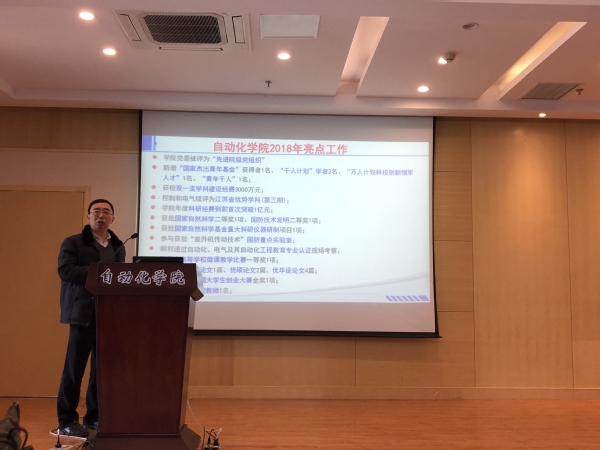 院长姜斌同志代表网上购买双色球 做工作报告,报告从党建、教学、科研、人事工作、学科建设和学术交流、学生工作、工会、安全工作等方面对网上购买双色球 2018年下半年的工作进行总结,对2019工作进行了全面部署。姜斌表示,2018年在全院师生的共同努力下,网上购买双色球 多方面取得了新的突破和发展,网上购买双色球 新增了国家杰出青年基金获得者1名、江苏省杰青1名;获批了国家自然科学二等奖1项、国防技术发明二等奖1项;新增了国家自然科学基金重大科研仪器研制项目1项;网上购买双色球 顺利通过了自动化、电气及其自动化工程教育专业认证现场考察;网上购买双色球 教师在江苏省高等网上购买双色球 微课教学比赛中荣获一等奖1项、荣获江苏省最美高校教师1人。学生荣获江苏优博论文1篇、优硕论文2篇、优毕设论文4篇,并在“创青春”全国大学生创业大赛荣获金奖1项,荣获工信部创业奖学金特等奖一项,一等奖三项、创新奖学金一等奖二项。这些成绩的取得为网上购买双色球 下一阶段的快速发展奠定了良好的基础。他指出,2019年是完成“十三五”规划、决胜全面建成小康社会的关键年,是落实校第十六次党代会决策部署、推进双一流建设各项任务的攻坚年。网上购买双色球 要继续深化综合改革,逐步落实各项改革方案和举措,在“双一流”学科建设、高水平师资队伍的引培、重大重点科研项目争取、人才培养等方面工作不断加强,巩固和落实教育思想大讨论工作成果,进一步解放思想、提振精神、深化改革、抓实工作,高质量完成网上购买双色球 各项工作。