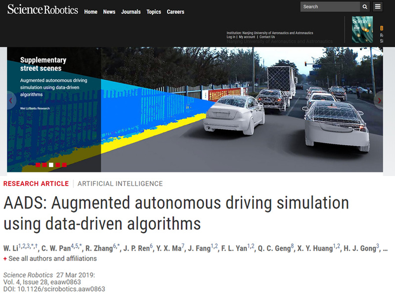 龚华军教授指导的博士生李伟同学,以第一作者和共同通讯作者身份发表的学术论文“AADS: Augmented Autonomous Driving Simulation Using Data-Driven Algorithms”,于2019年3月27日刊登在《科学》杂志子刊《科学·机器人学》(Science·Robotics),该刊编辑在杂志主页对论文进行了推荐。该研究成果介绍了一种增强现实的自动驾驶仿真系统,它可自动创建逼真的道路场景,为自动驾驶车辆提供更为可靠且廉价的实验室模拟方法,可大规模用于训练和测试评估自动驾驶系统的路径规划和决策算法。《科学·机器人学》旨在传播机器人与人工智能相关领域的代表性研究成果,平均每期刊出不多于4篇的研究类文章。