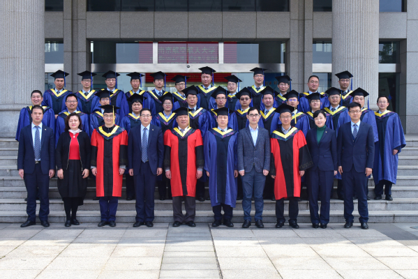 在庄严的学位授予仪式上,沈以赴教授、宋晓峰教授和导师代表罗运虎副教授为全体毕业生拨流苏、颁发学位证书并合影留念。