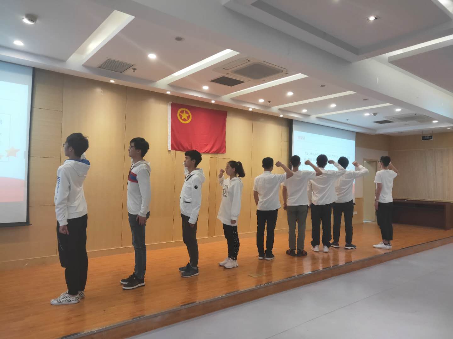 2019年4月28日下午四点,网上购买双色球 举办“新青年与五四运动”素养公开课暨新团员入团仪式,网上购买双色球 团委书记刘斐文、2017级本科生辅导员侯新闻、2018级本科生辅导员杨兴旺、汪明锐以及各班班长及团支书参加了本次活动。活动初始,网上购买双色球 为8名新入团团员举办了入团仪式,老团员为新团员佩戴了团徽并带领新团员进行了宣誓。