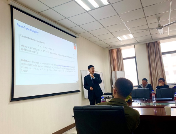 韩教授向在场师生分享了他在多智能体系统固定时间协同控制方面的最新研究成果。首先,韩教授通过三个简单的例子,讲述了固定时间稳定性的基本概念,并为我们介绍了固定时间协同控制相比其他控制方法的优点:具有更好的闭环性能和抗干扰性能;具有较快的收敛速度;在不需要系统的初始条件的情况下能估计出系统到达稳定的时间。这些优点符合多智能体系统的研究需要。在此基础上,韩教授详细介绍了几类多智能体系统的固定时间协同控制方法。随后,韩教授讲述了利用固定时间一致性理论解决分布式优化问题的方法。
