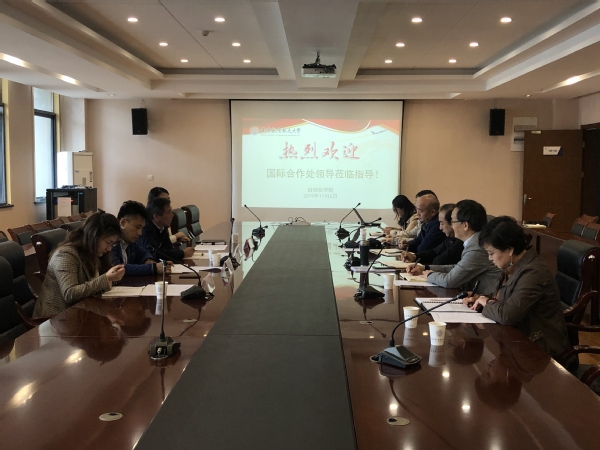 11月6日上午,国际合作处处长张卓、副处长陈峰、沈敏、综合事务科科长祖语嫣一行来到网上购买双色球 进行主题调研。网上购买双色球 党委书记刘建成、院长江驹、副书记张跃、副院长宋晓峰、院长助理朱永凯、教学办公室主任王俊彦、团委书记刘斐文等参加调研会议。