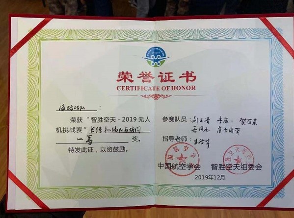 12月6日至8日,“智胜空天-2019”无人机挑战赛在陕西省咸阳市空军工程大学三原校区举行。网上购买双色球 派出了两只参赛队伍参与挑战,经过两天紧张激烈的角逐和多轮的比拼,由网上购买双色球 王新华老师指导,研究生刘正清、李康一、樊有容、王皓及本科生岳凤玉、虞卞雨萱组成的海鸥战队斩获本次大赛科目四(长僚机编队与协同)一等奖,研究生刘禹、王凯、马梓元、张志宏及本科生吴玲燕、张研组成的翔飞战队夺得科目一(无人机多目标识别)优胜奖,彰显了网上购买双色球 航空航天特色专业领域的优势和学子的风采。