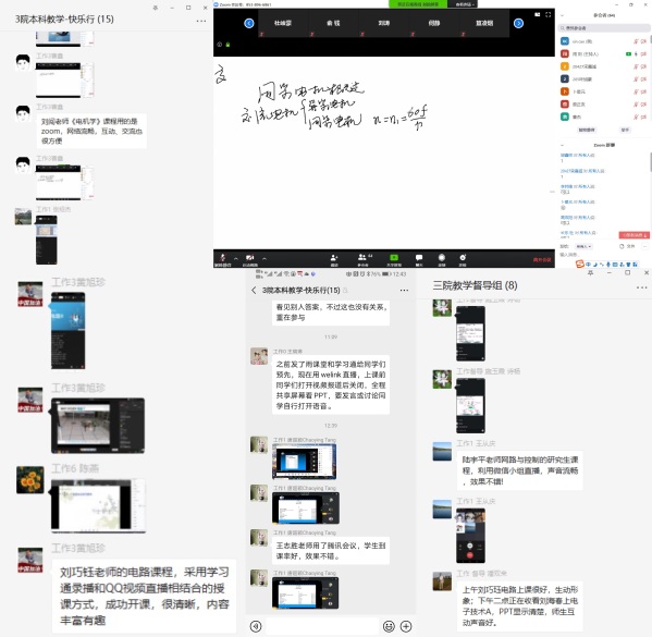 各位领导、系主任在查课听课后也提出了自己的建议。江驹院长提出不管用何种方式,都要从实际出发,实事求是地以保证教学效果为重。刘建成书记也选择了两位老师的课程在线听课,两位老师都针对在线教学作了精心的充分准备,学习通平台上的学习资料展现出效果很好,但是由于网络流量和平台容量有限的问题,与学生的互动不够顺畅,学生的学习状态无法及时掌握,希望老师们积极探索有效的实时互动方式。张跃副书记在查课听课过程中也重点关注了学生参与课堂情况,希望多多增加互动提问,监控和帮助学生集中课堂注意力。