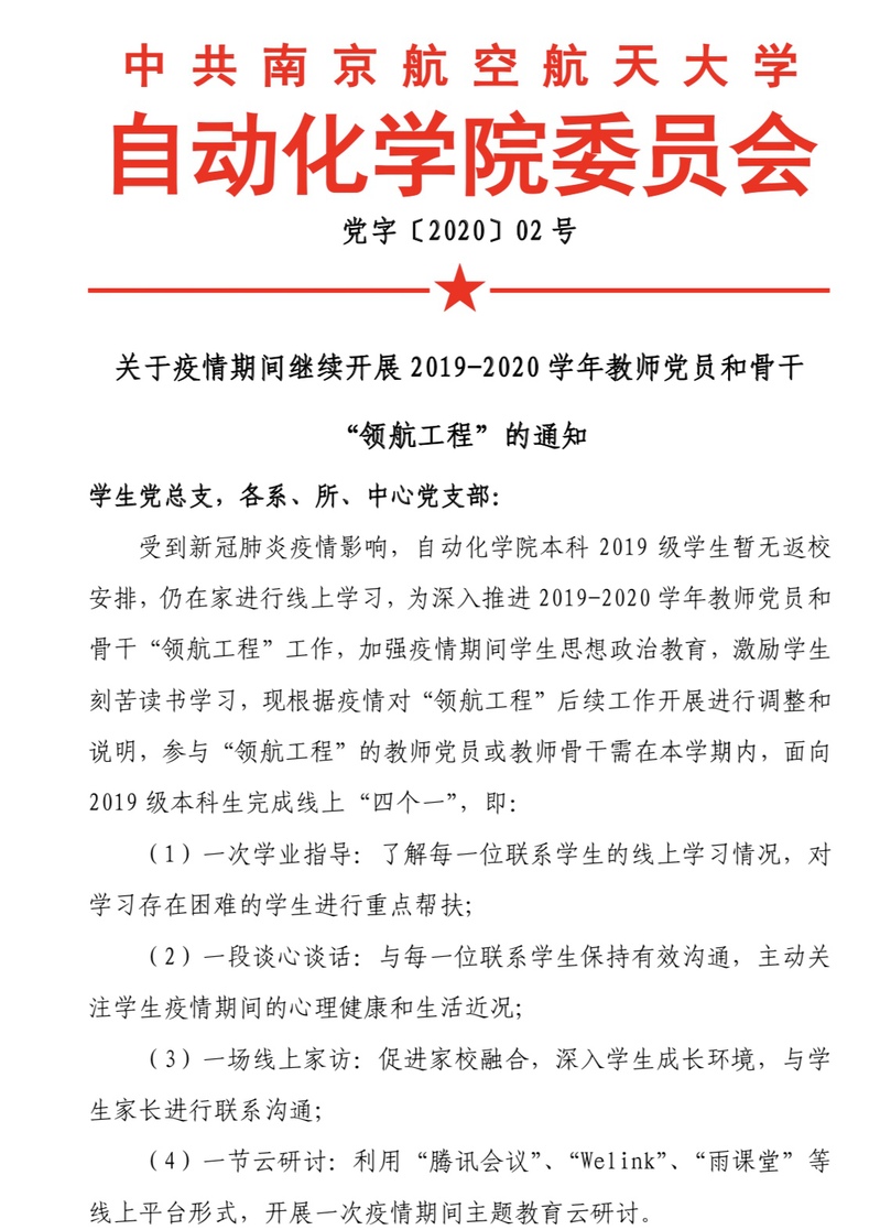 关于疫情期间继续开展2019-2020学年教师党员和骨干“领航工程”的通知
