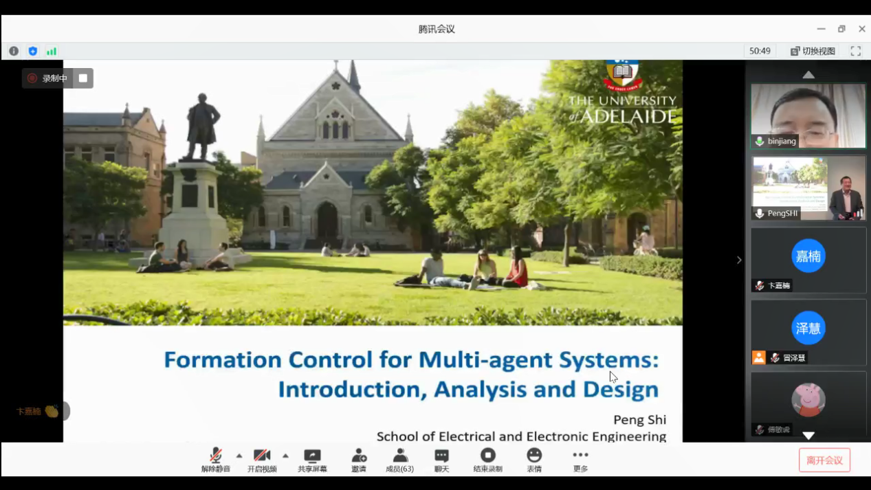 8月12日下午,澳大利亚阿德莱德大学电气与电子工程学院石碰教授应我校国际合作处和网上购买双色球 的邀请,通过腾讯会议作了题为“Formation Control for Multi-agent Systems:Introduction,Analysis and Design”的线上学术报告,报告由网上购买双色球副校长姜斌教授主持。网上购买双色球 副院长陈谋教授,学院陆宁云、刘春生、冒泽慧、欧阳权、张柯、马亚杰等师生在线参加会议。参会师生对石碰教授的交流分享表示热烈欢迎。