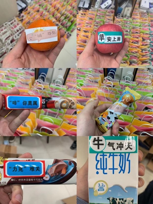 为考研学子们精心准备的慰问礼品袋,其中包含中性笔、涂卡笔、橡皮等必备文具、《致考研学子的一封信》、以及牛奶、巧克力、水果、咖啡等包含“牛”气冲天、“力克”难关、“苹”安上岸的美好祝愿的纪念品。