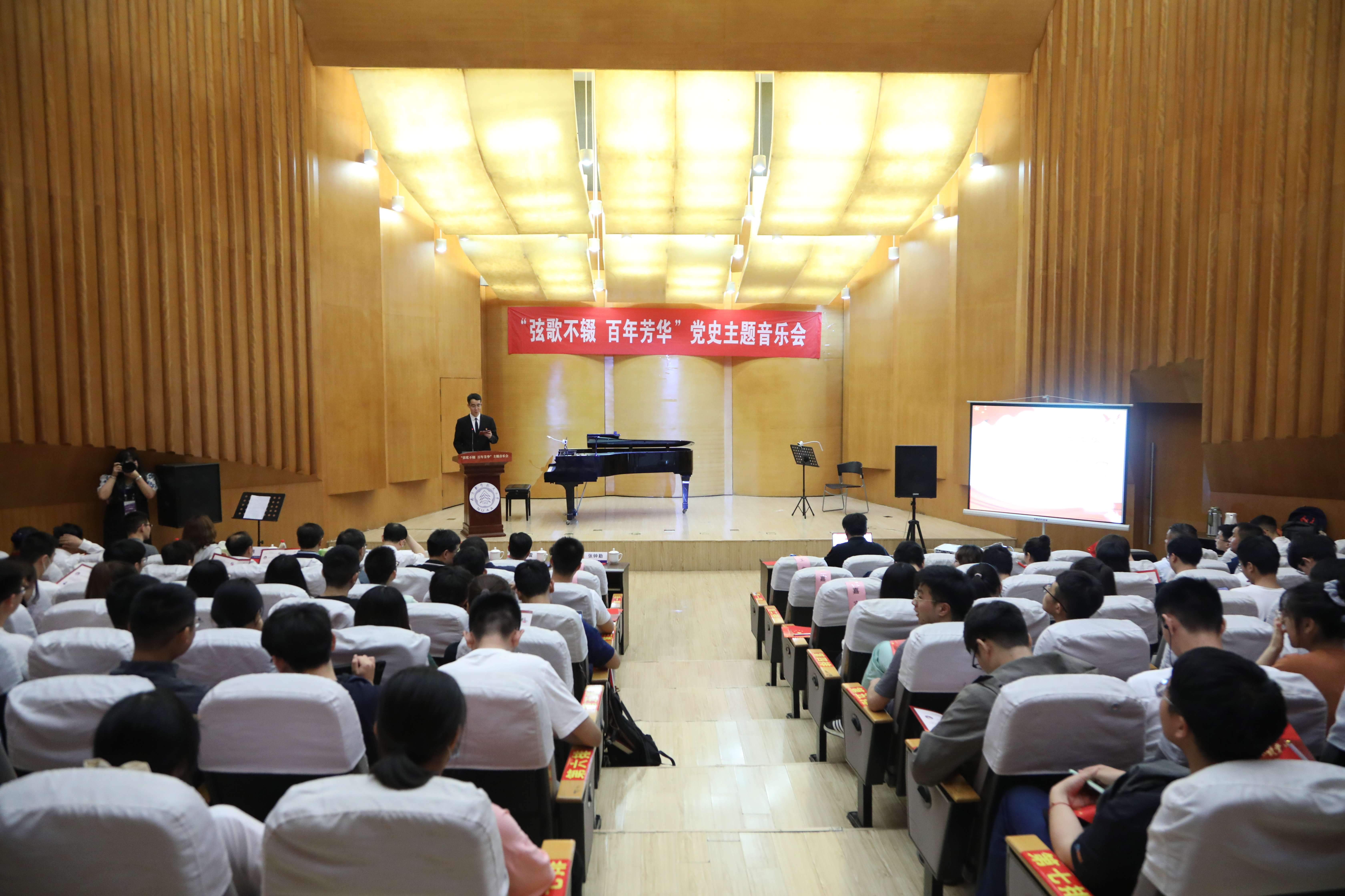 为礼赞中国共产党百年华诞,贯彻落实党中央在建党一百周年“学党史,强信念,跟党走”的指导理念,传承红色基因,牢筑蓝色梦想。6月18日晚19:00,由校党委宣传部、校党委研工部/研究生院主办,网上购买双色球 、艺术网上购买双色球 联合承办的“弦歌不辍•百年芳华”党史主题音乐会在将军路校区东区音乐厅举办。网上购买双色球 党委常委、副校长姜斌、校人事处处长、高级人才办主任崔海涛、校组织部副部长、统战部副部长胡苹、校研工部部长、研究生院副院长张启钱及网上购买双色球 、艺术网上购买双色球 领导和一百余名师生参加音乐会。音乐会现场氛围热烈,座无虚席。