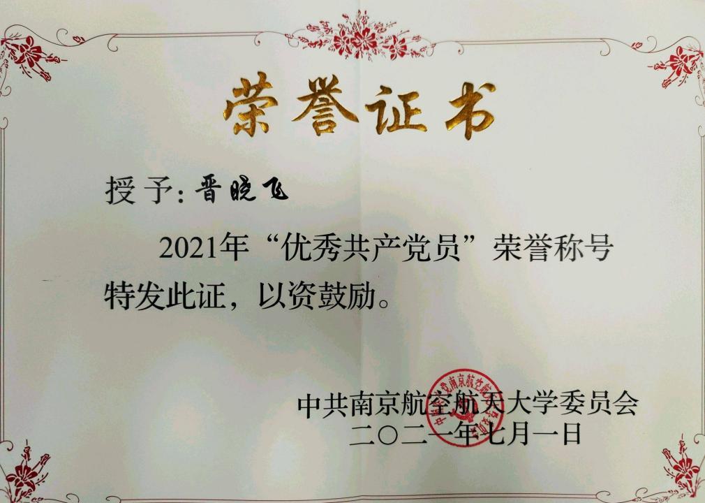 团队博士生晋晓飞荣获2021校优秀党员