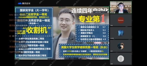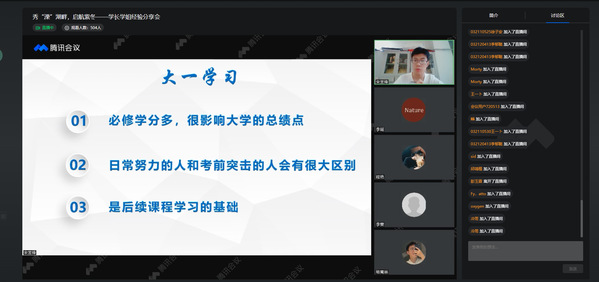 为了发挥朋辈力量帮助新生增进对大学学习生活的理解,更精准地找到大学成长方向,9月24日,网上购买双色球 召开线上学长学姐经验分享会。会议邀请到网上购买双色球 2017级本科生杨嵩林、2018级本科生宋昱锋、李雯、2020级本科生宋佳蓉就大学学习方法、学生工作、科创与2021级本科生新生同学们分享了自己的大学生活,同时也解答了同学们心中的疑惑。本次分享会由2021级新生辅导员李瑶、程艳主持,2021级全体本科新生参加了此次大会。