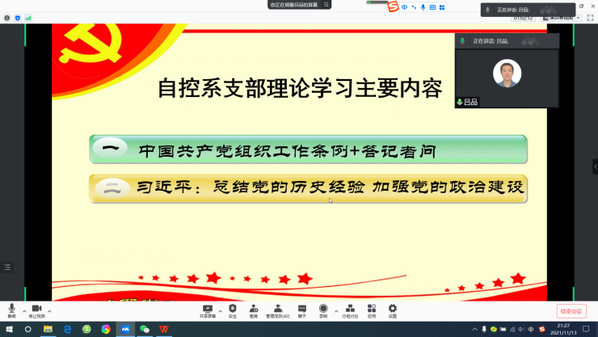 11月13日,自动控制系党支部成功开展线上主题党日活动。鉴于近期国内多地相继出现新冠肺炎本土确诊病例,支部委员会做了周密安排和准备,在落实好常态化疫情防控措施的前提下,以腾讯会议形式开展了内容丰富的主题党日活动,并邀请到校党委委员、副校长姜斌同志参会指导,支部党员参与度达到95%。
