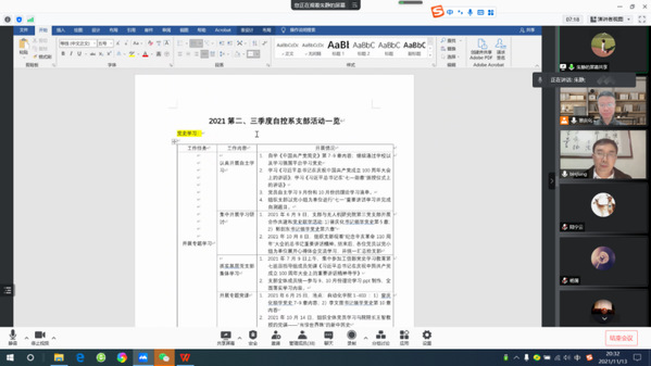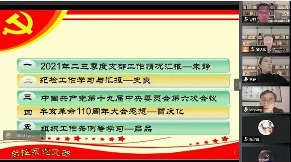 支部副书记朱静同志主持活动,对今年以来自控系支部的相关在党史学习教育、专题党课、联学共建、线上线下宣讲等工作、活动情况进行了阶段性总结汇报。