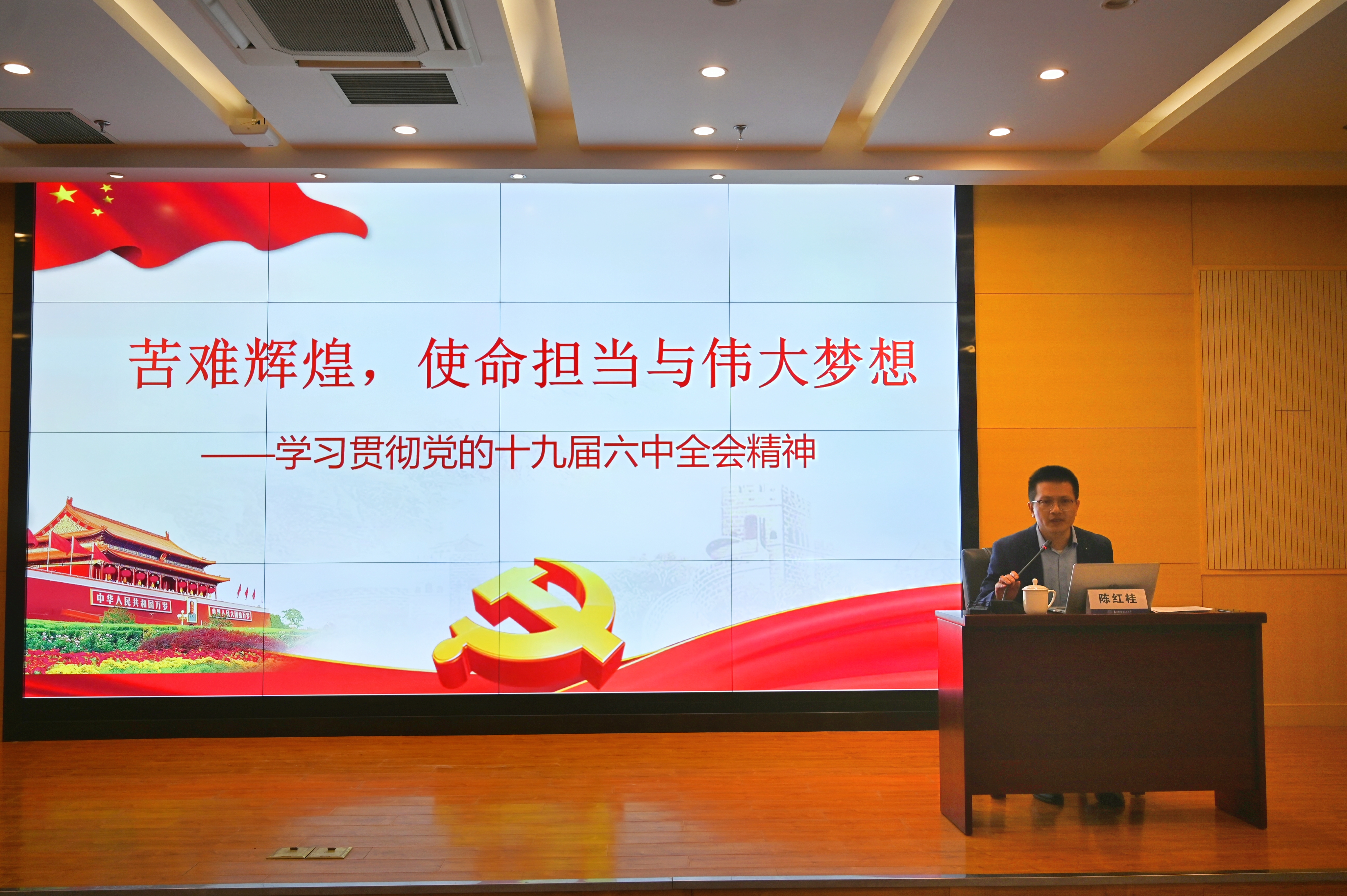 开班仪式上,陈红桂副教授进行了主题为《苦难辉煌,使命担当与伟大梦想——学习贯彻党的十九届六中全会精神》的专题讲座。陈红桂在讲座中介绍了十九届六中全会的背景与概况,阐释了会议的内容与意义,带领青马班成员深刻学习贯彻党的十九届六中全会精神。他强调:不忘初心,方得始终。当代青年要以饱满的热情参与到学习中,勇担历史重托,完成历史赋予的庄严使命,牢记中国共产党是什么、要干什么这个根本问题,以咬定青山不放松的执着奋力实现既定目标,以行百里者半九十的清醒不懈推进中华民族伟大复兴。