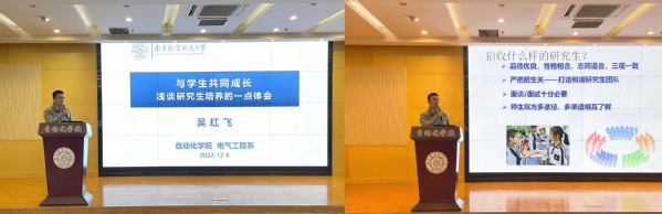 吴红飞以《与学生共同成长,浅谈研究生培养的一点体会》为题,从六个维度介绍了自己培养研究生的基本技能、责任意识、团队协作、创新能力、学术视野、领导能力等,与导师们大家分享了自己在研究生培养方面的心路历程和感受,乐见自己与学生共同成长一起成功。