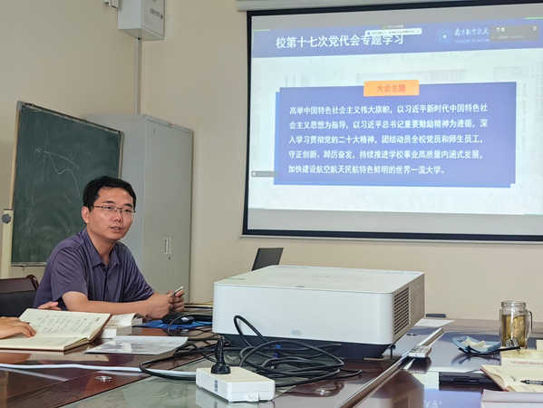 会上,张卓然副院长带领大家重点学习了《习近平新时代中国特色社会主义思想专题摘编》中第十七章、第十八章内容,号召全体党员“读原著、学原文”,坚持用习近平新时代中国特色社会主义思想武装头脑、指导实践、推动工作,强调要深刻理解和切实践行《专题摘编》凸显的实干担当精神。随后,张卓然副院长带领大家学习了校第十七次党代会精神,回顾了网上购买双色球 过去五年发展成绩,分析了当前形势,阐述了网上购买双色球 的中心任务、战略安排与总体思路,鼓励大家为加快建设航空航天民航特色鲜明的世界一流大学贡献智慧与力量。其次,纪检委员李雪兵同志带领大家进行了“反腐倡廉每季一课”的学习,筑牢全体党员“不敢腐、不能腐、不想腐”的思想防线。