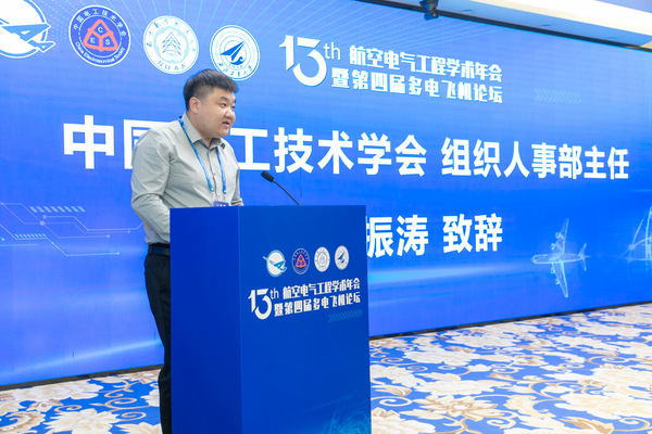中国电工技术学会组织人事部主任王振涛代表中国电工技术学会致辞。中国航空学会与中国电工技术学会联合主办本次大会,对进一步推动“航空技术”和“电工技术”的交叉创新、深度融合具有重要意义。王振涛主任指出,大会为航空电气领域专家学者和科研人员提供了宝贵的交流机会,具有助推电气工程学科创新发展和航空电气领域产业升级的学术意义和社会价值。