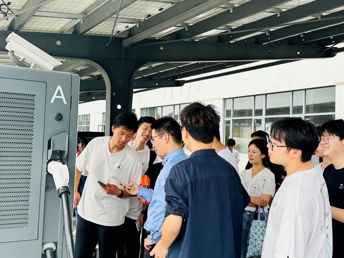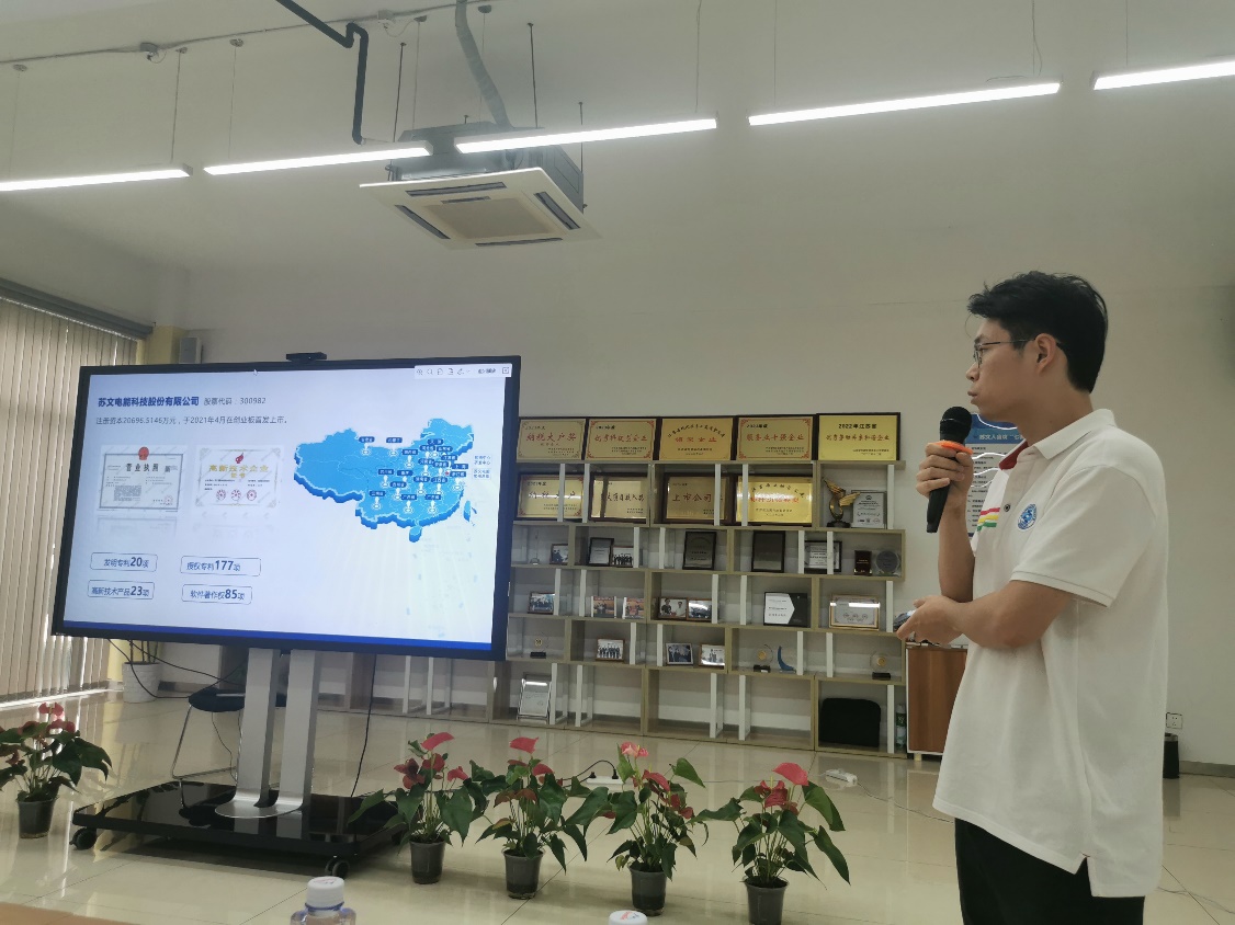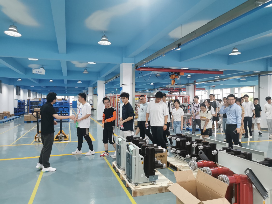 师生一行跟随苏文电能储能产品经理谷康伟实地参观苏文电能电力运维核心区域配电运维大厅、电力设备生产流水线、新能源板块储能箱以及公司零碳园区,近距离了解如何通过先进的智能监控系统和数据分析技术实现对电网运行的实时监控和精准管理与电力设备精密高效的生产全过程。学生们在参观过程中深入了解苏文电能的智能制造战略和数字化转型计划,对电力行业的未来发展充满了期待。