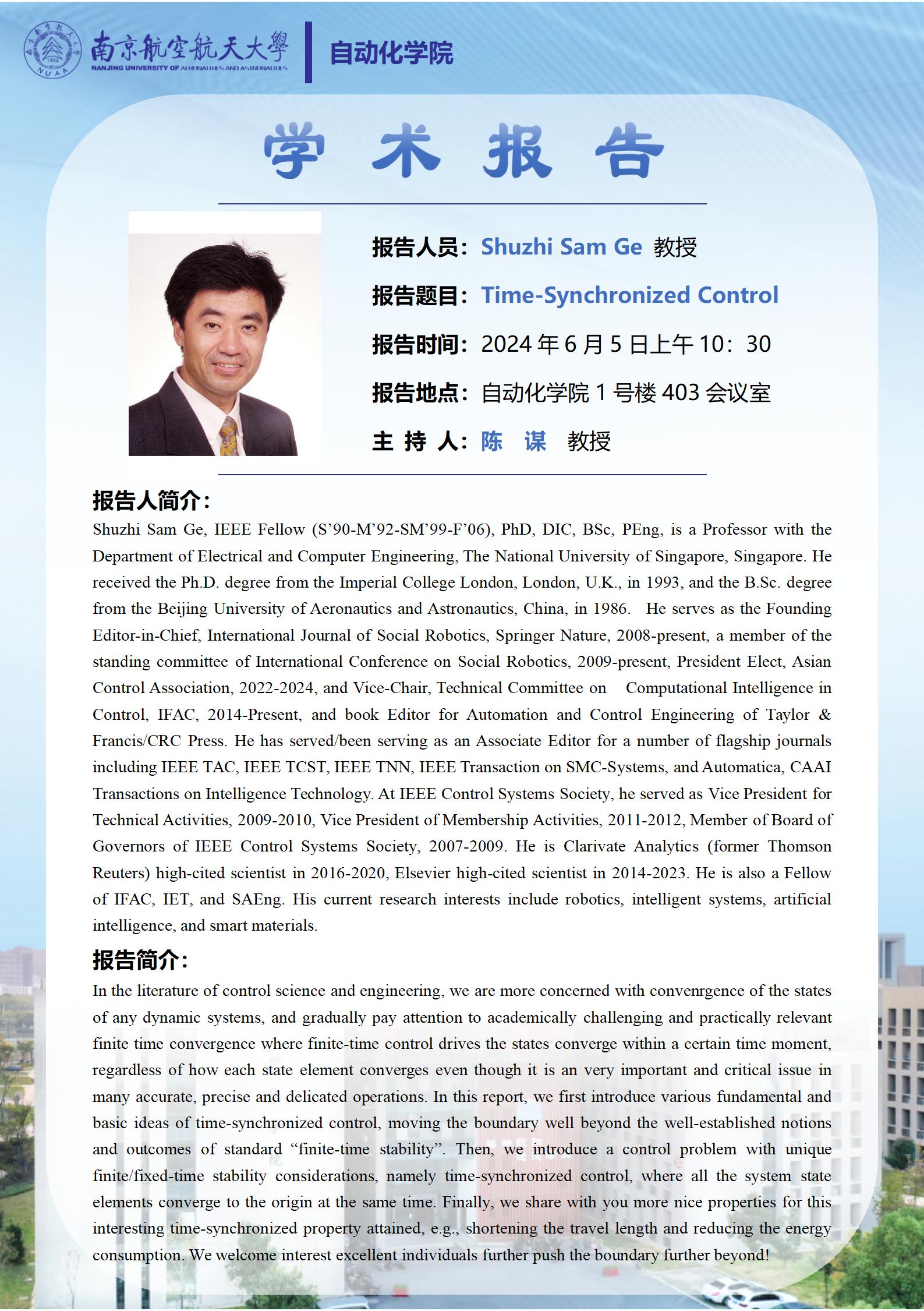 【学术报告】Shuzhi Sam Ge:Time-Synchronized Control