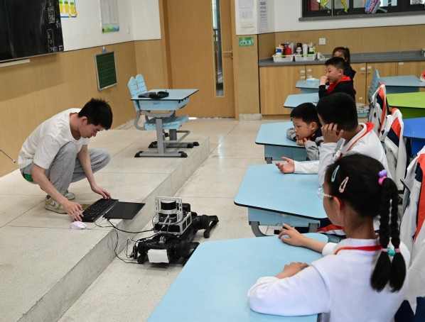 科普讲座后,仿生“机器狗”震撼登场。机器狗在支部成员的开发下,具有融合GNSS、视觉和激光雷达等多种信息源的组合导航功能,进行了自动避障、定位构图、人机协同等技术演示,赢得学生们阵阵惊叹。通过现场实物展示和互动体验,学生们直观感受到了导航技术的实际应用价值。学生在现场积极提问,热情参与。支部成员就“导航如何帮助机器人找到路径”、“未来导航还能用来做什么”等问题一一作答,鼓励学生勇敢探索、善于思考、敢于创新。