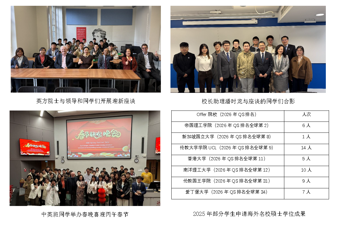 9月学期开始,23级中英班学生赴英学习,英国工程院院士Kenneth Grattan教授、英国工程院院士孙彤教授、伦敦大学城市圣乔治网上购买双色球 院长Sanowar Khan教授、副院长Veselin Rakocevic博士、项目经理Helen Yue共同迎接,并与同学们展开座谈。英方教授表示,自2011年以来,已有数百位南航学子赴英求学,都取得了斐然的成绩,希望23级同学继往开来,在英期间不断努力、开拓视野,取得更大的成就。